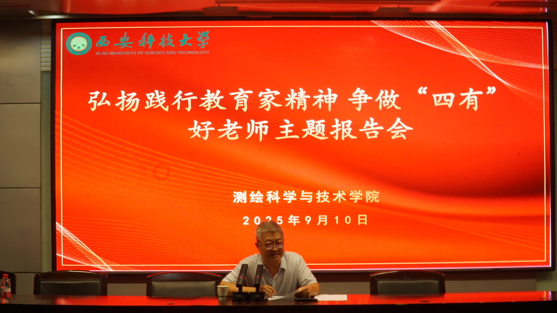 9月10日下午,学院在骊山校园图书馆二楼报告厅举办“弘扬践行教育家精神,争做‘四有’好老师”主题报告会,校督导专家陈晓宁作报告,全体教工和学生代表参会,学院党委书记戴开文主持。
