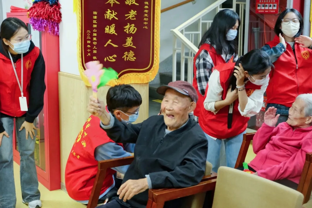 学生志愿者们精心准备了一系列活动,歌唱、朗诵声声入耳,小品环节更是惹得老人们阵阵笑声。丰富的表演形式温暖着在场的老人们,养老院内外洋溢着轻松的氛围。