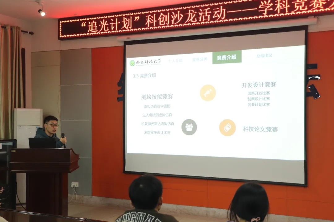 激发学习热情,提升学科素养。王新磊学长从个人实际出发,先向大家讲述了他的竞赛经历,让同学们充分感受到了学科竞赛的魅力。接着他主要介绍了测绘学科创新创业智能大赛,从赛事背景、赛道设置、竞赛方式等方面对该比赛进行了细致讲解,并建议同学们要加强技能提升,动员同学们积极参与学科竞赛,鼓励在实践中提升专业素养。
