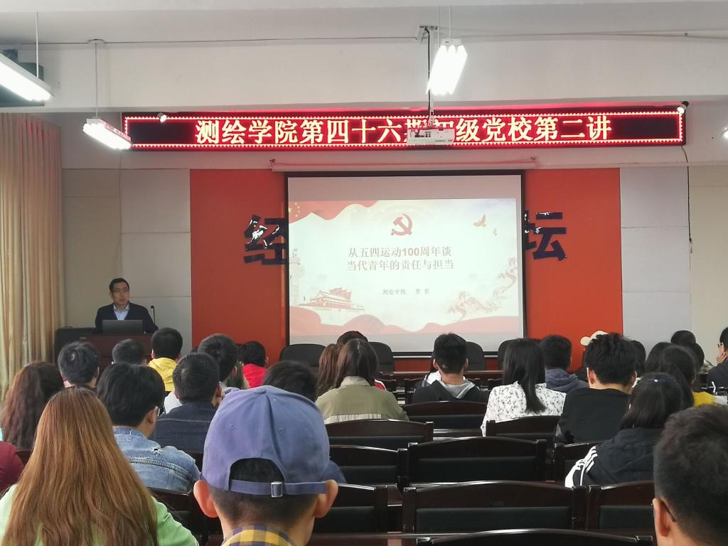 党课开始时,贾书记先向大家讲述了入党流程,使大家对其有了一定了解。在本次党课中,贾书记主要以五四运动100周年与世界当前格局为重点向大家讲述了历史上的五四运动,以及国内外形势的变化。