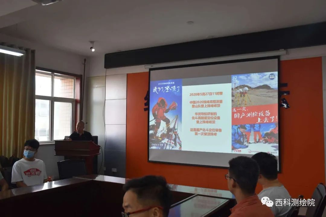 胡炜教授讲授了2020年中国测量登山队历尽艰辛,成功登上珠峰峰顶的英雄事迹。并通过与学生互动交流为什么要进行第三次珠峰测量、第三次珠峰测量和前两次有何不同、珠峰测量难在哪、国产北斗装备为什么能登顶珠峰等方面,为我院学生生动讲述了珠峰高程测量的中国故事,同时向大家传递信号——中国测绘人测量的不仅仅是中国的精度,也是世界的精度;中国测绘人攀登的不仅仅是自然的高峰,更是测绘科技的高峰。
