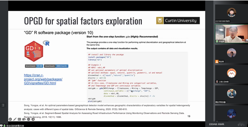 11月23日下午,英国上市官网365举办“胡杨林大讲堂”。澳大利亚科廷大学博士生导师宋泳泽博士应邀做客我院“胡杨林大讲堂”,作了题为《Geospatial Data Analysis and Geospatial Artificial Intelligence(GeoAI)》的学术报告。本次胡杨林大讲堂以线上腾讯会议形式举行,由副院长史晓亮主持。