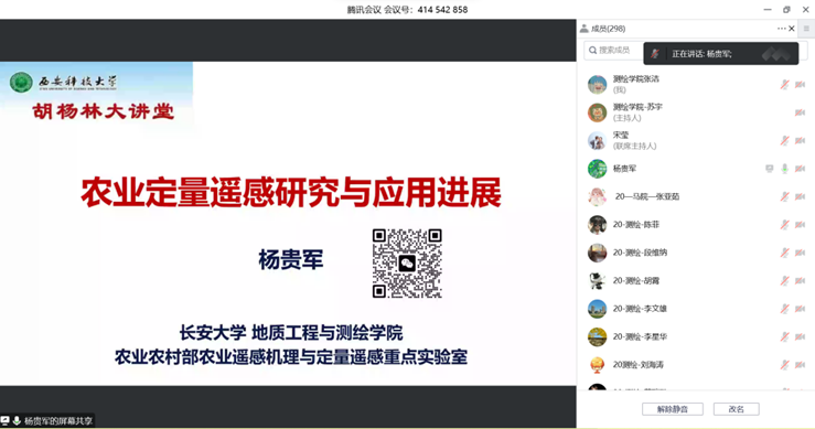 11月9日下午,英国上市官网365举办“胡杨林大讲堂”。长安大学地质工程与英国上市官网365杨贵军教授应邀做客我院“胡杨林大讲堂”,作了题为《农业定量遥感研究进展及应用》的学术报告。本次胡杨林大讲堂以线上腾讯会议形式举行,报告由副院长史晓亮主持。