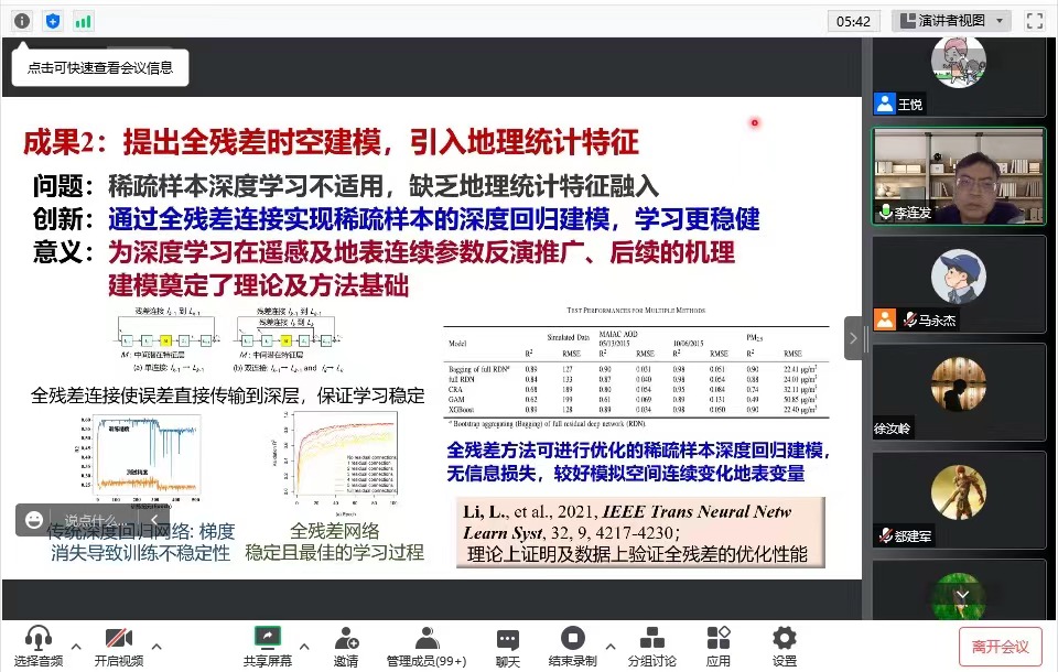 报告会上,李连发研究员主要围绕稀疏样本下高精度时空数据智能建模研究工作,讲解了在限制性时空混合建模、全残差深度回归及地理图网络过程建模等方面所取得的阶梯性创新性成果等。最后,李连发研究员同与会教师就相关问题进行了交流和讨论。