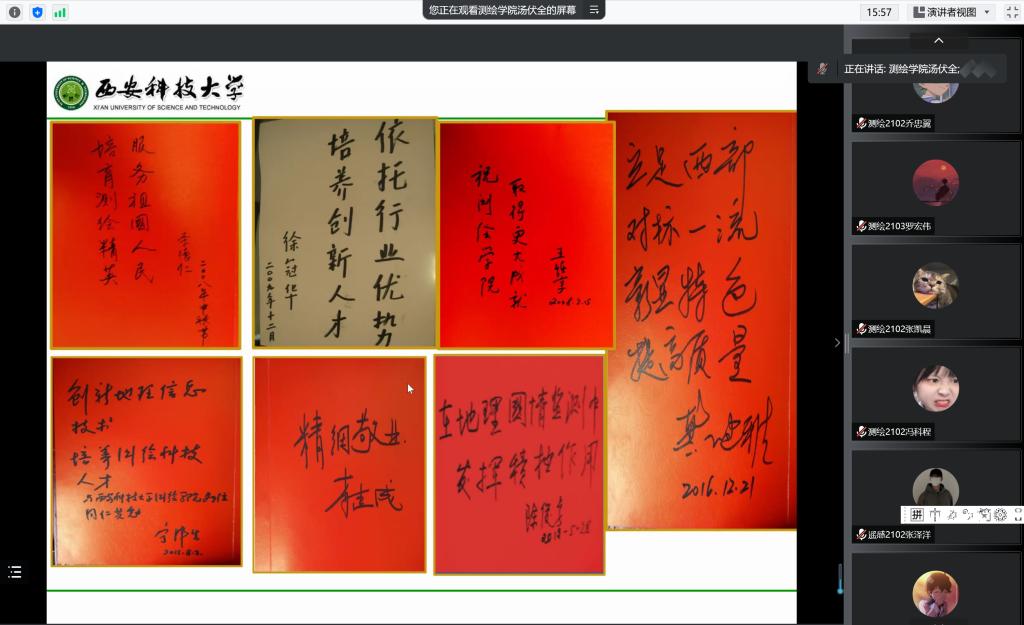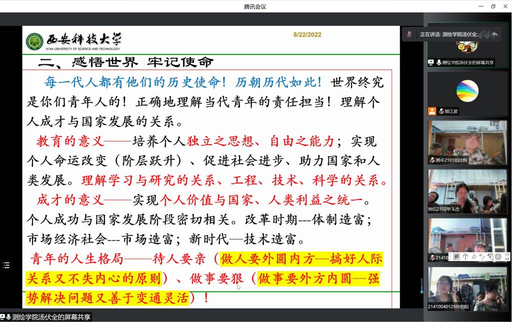 2022年8月22日下午,测绘科学与技术学科带头人汤伏全教授为21级军训生作了“测绘学科简介与大学生思政”报告,院党委副书记郝卿主持。