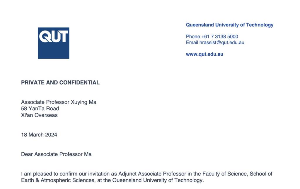 近日,据澳大利亚昆士兰科技大学(Queensland University of Technology)人力资源部官方通知,经过澳大利亚科学院院士Lidia Morawska教授推荐和昆士兰科技大学学术委员会评审,2024年3月18日英国上市官网365地信系教师马绪瀛获聘昆士兰科技大学客座副教授(Adjunct Associate Professor)、兼职博/硕士生导师,成为我校首位获聘昆士兰科技大学的客座专家。