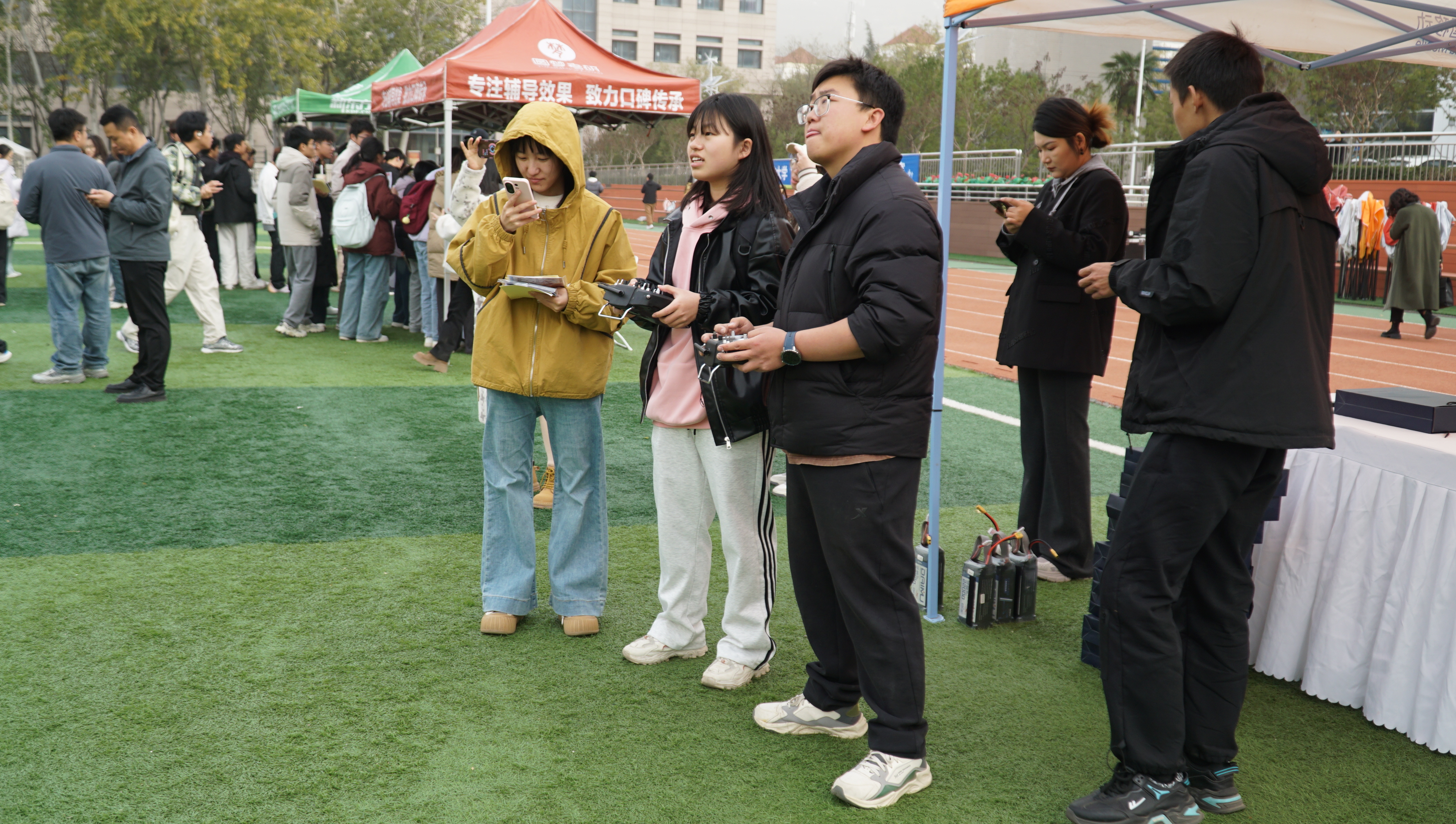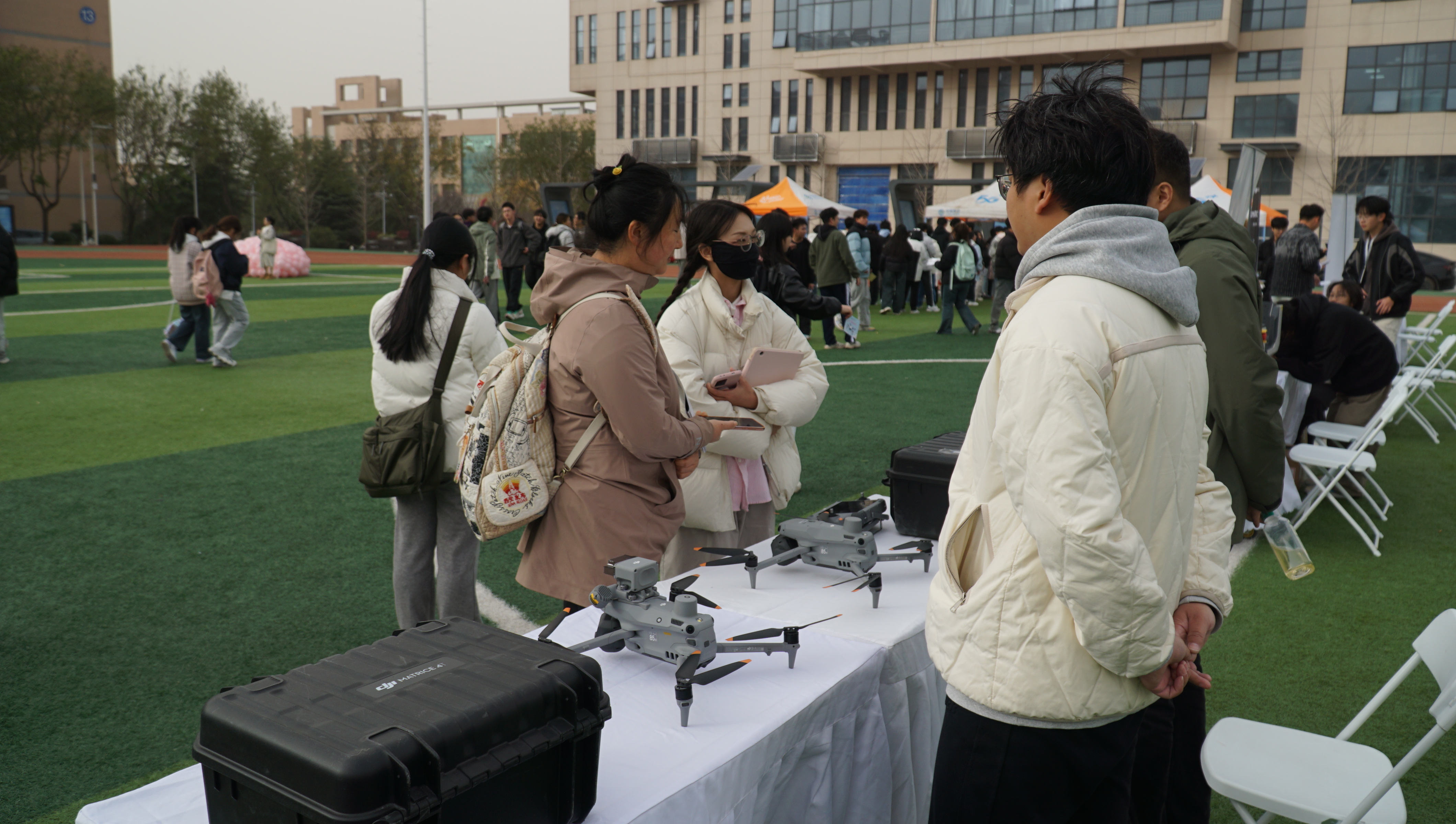 科技展互动体验环节在体育馆前田径场全面展开,成为本次展览的高光亮点。活动现场化身科技秀场,十余台行业级无人机组成的展示矩阵前围满师生,大疆M300、Mavic3E等明星机型与智能机场设备引发阵阵惊叹。