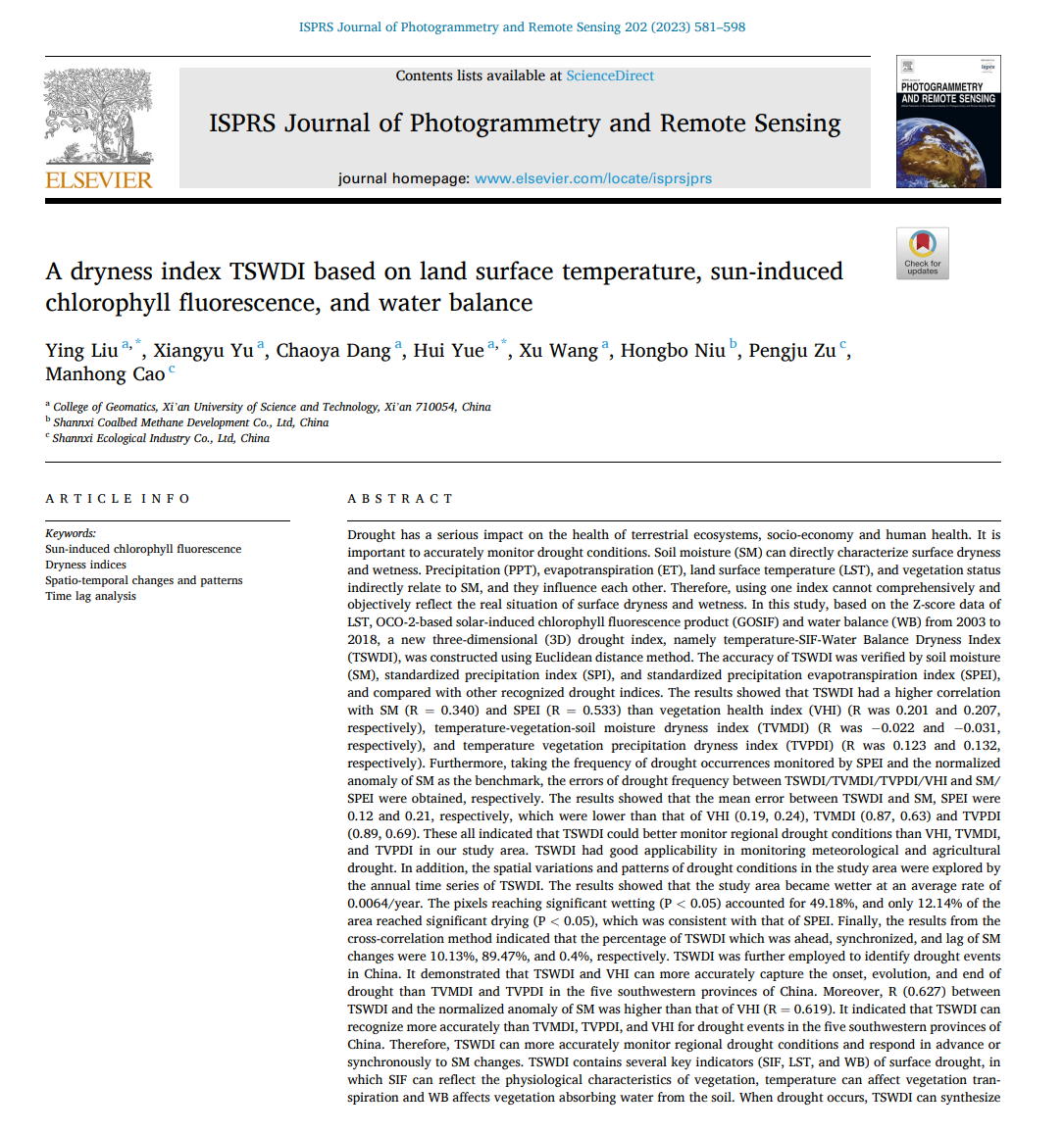近日,英国上市官网365矿区定量遥感研究团队刘英、于翔宇(硕士研究生)、党超亚(硕士研究生)、岳辉等,在《ISPRS Journal of Photogrammetry and Remote Sensing》(P&RS)发表了题为“A dryness index TSWDI based on land surface temperature, sun-induced chlorophyll fluorescence, and water balance”的研究论文。ISPRS Journal of Photogrammetry and Remote Sensing(P&RS)是国际摄影测量与遥感学会(ISPRS)的官方期刊。P&RS被公认为遥感领域最具权威性的国际期刊之一,2022年最新影响因子为12.7,5年影响因子为12.4,该杂志为所有国家从事摄影测量、遥感、空间信息系统、计算机视觉和相关领域的许多学科的科学家和专业人员提供了一个交流渠道,旨在作为这些学科进展的来源参考和档案。