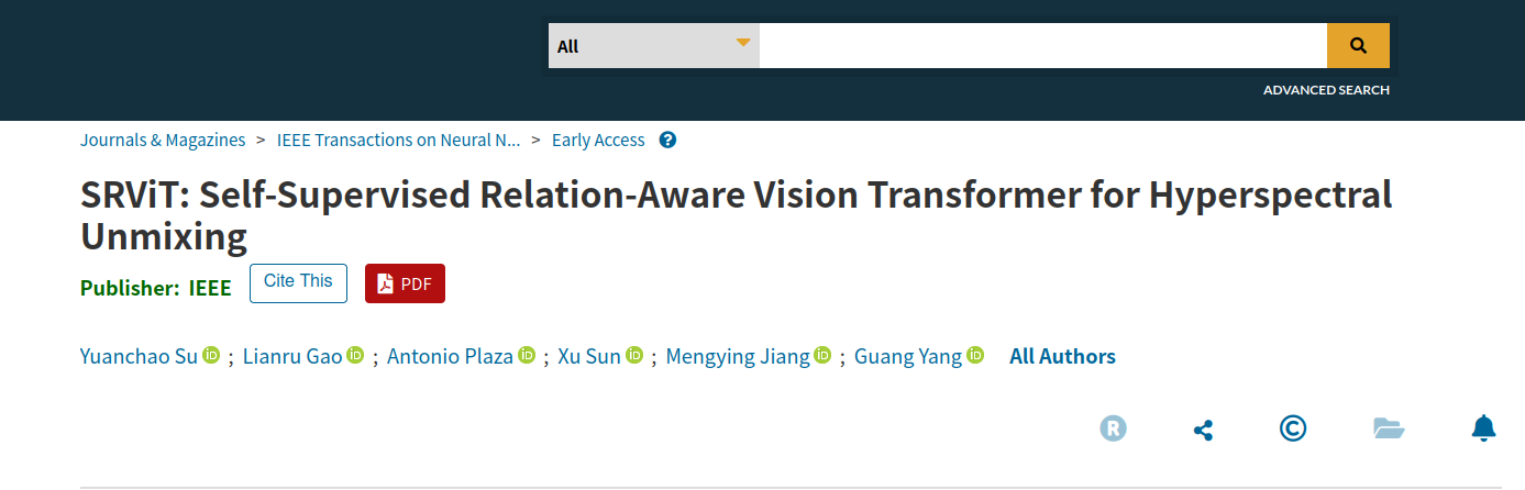 近日,我院苏远超副教授联合中国科学院空天信息创新研究院、西班牙埃斯特雷马杜拉大学等团队在人工智能与遥感交叉领域的国际顶级期刊《IEEE Transactions on Neural Networks and Learning Systems》(IEEE TNNLS,中科院一区,影响因子10.2,近5年平均影响因子10.4)上发表题为《SRViT: Self-Supervised Relation-Aware Vision Transformer for Hyperspectral Unmixing》的研究论文。
