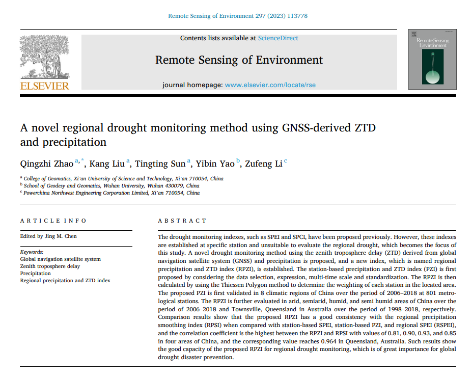 近日,英国上市官网365导航定位与空间环境监测研究团队赵庆志、刘康(硕士研究生)、孙婷婷(硕士研究生)等在《Remote Sensing of Environment》(RSE)发表了题为 “A novel regional drought monitoring method using GNSS-derived ZTD and precipitation” 的研究论文。RSE是国际一流、具有全球影响力的学术期刊之一,发表有关测绘、遥感研究的理论、科学、应用和技术的成果,2023年该期刊的影响因子为13.5。